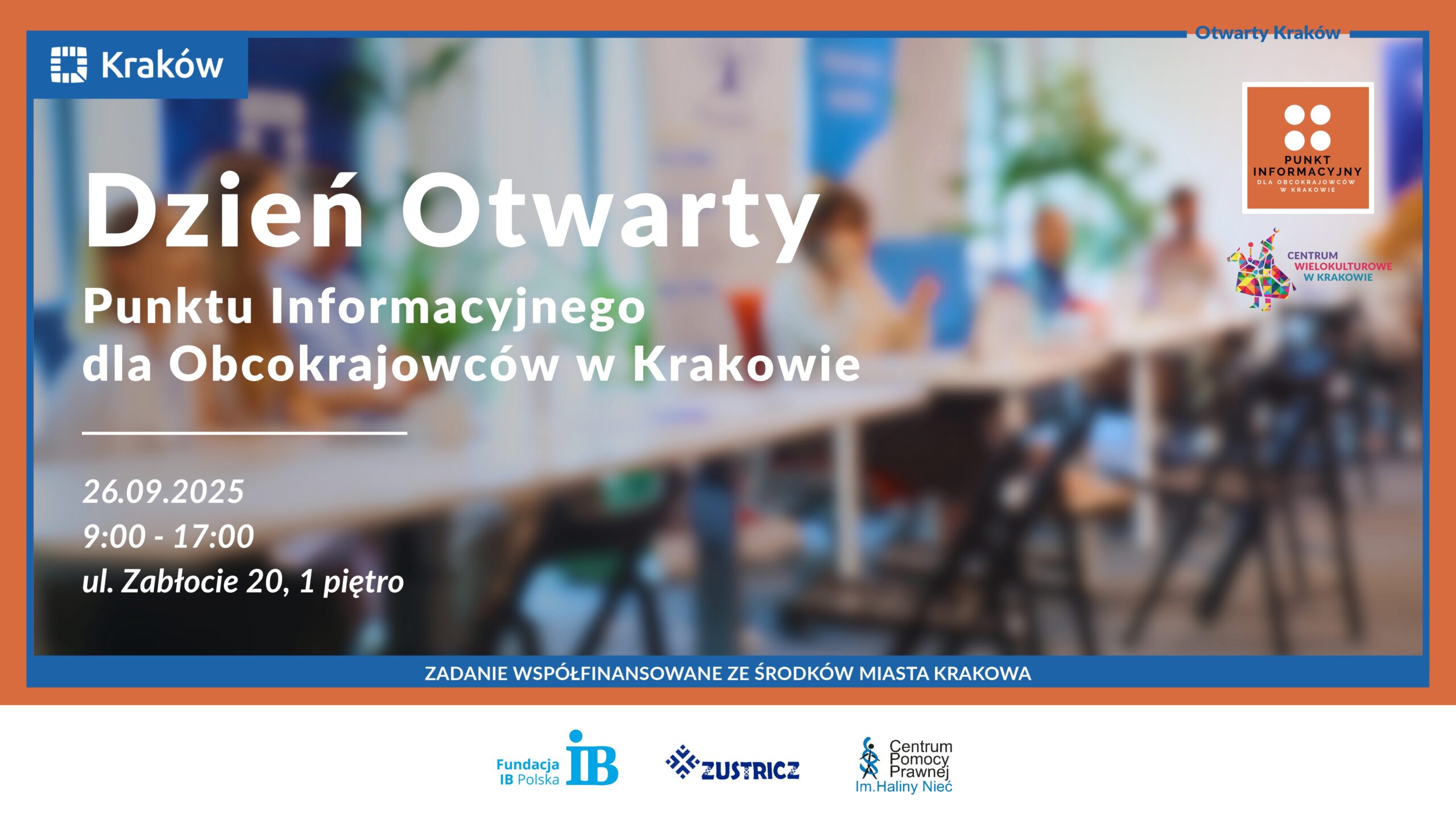 W piątek 26 września Fundacja IB Polska zaprasza na Dzień Otwarty Punktu Informacyjnego dla Obcokrajowców. Bezpłatne konsultacje specjalistów będą trwały od godz. 9:00 do 17:00 w siedzibie Punktu i Centrum Wielokulturowego w Krakowie w budynku Klastra Innowacji Społeczno-Gospodarczych Zabłocie Space, na ulicy Zabłocie 20 (1 piętro).