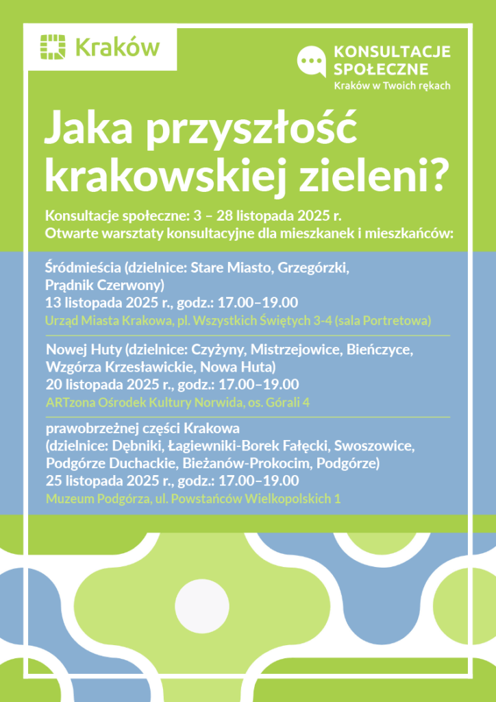 Prezydent miasta zaprasza mieszkanki i mieszkańców Krakowa do udziału w konsultacjach społecznych w sprawie projektu dokumentu „Błękitno-zielona polityka Krakowa. Koncepcja zazieleniania miasta do 2050 roku” stanowiącego aktualizację programu określającego kierunki rozwoju i zarządzania terenami zieleni w Krakowie. Konsultacje potrwają do 28 listopada.
